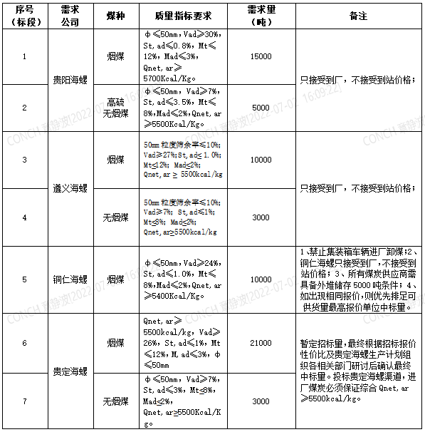 海螺水泥貴州區(qū)域擬對2022年7月21日至2022年8月20日生產(chǎn)用煤炭進(jìn)行公開招標(biāo),選定中標(biāo)單位,現(xiàn)將相關(guān)招標(biāo)事宜公示如下: