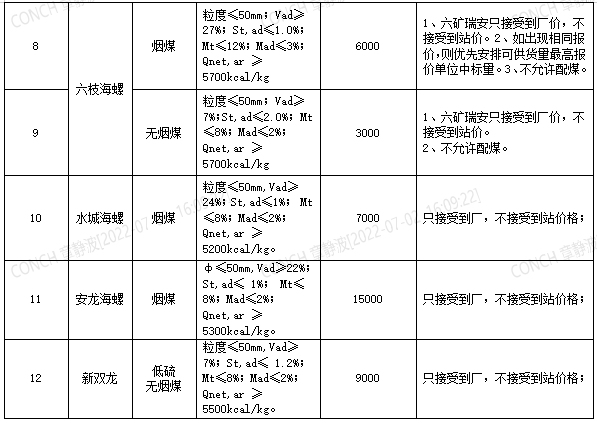 5. 2022年6月21日至2022年7月20日合同期內(nèi),若中標(biāo)單位在2022年7月6日24時(shí)前(銷發(fā)系統(tǒng)進(jìn)廠數(shù)量)小于合同約定量的30%的,不予參與海螺水泥貴州區(qū)域2022年7月21日至2022年8月20日煤炭招標(biāo)(僅買方原因或不可抗力因素除外,鐵路在途和在站煤炭不給予納入供貨量,僅以進(jìn)廠數(shù)量為準(zhǔn)),并取消在貴州區(qū)域所有海螺6個(gè)月內(nèi)的投標(biāo)資格。