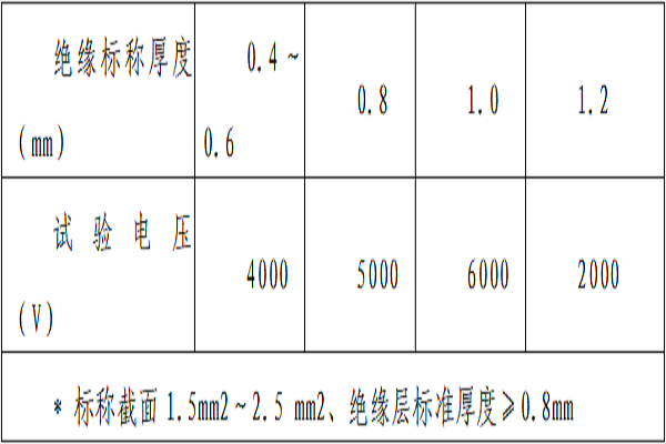 絕緣線芯應(yīng)經(jīng)受下表規(guī)定的交流50Hz電壓火花試驗。(火花試驗應(yīng)保證絕緣每點上經(jīng)受電壓的作用時間不少于0.2s)。