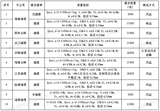根據(jù)2022年10月21日-2022年11月20日海螺水泥湖南區(qū)域各子公司煤炭需求,現(xiàn)擬對煤炭進行公開招標,選定中標人,為體現(xiàn)公平、公正、公開的原則,拓寬采購渠道,現(xiàn)將招標相關事宜公告如下: