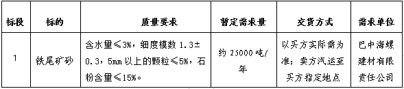 為進(jìn)一步提升鐵尾礦砂招標(biāo)的公平、公正、公開(kāi)透明性,根據(jù)巴中海螺建材(商混)生產(chǎn)需求情況,現(xiàn)組織開(kāi)展鐵尾礦砂公開(kāi)招標(biāo),特將招標(biāo)事宜公告如下: