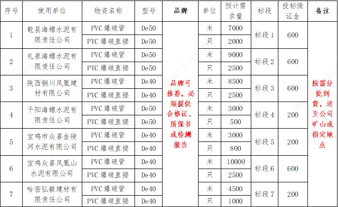 2.交貨地點(diǎn):禮泉海螺、乾縣海螺、鳳凰山公司、金陵河公司、千陽(yáng)海螺、鳳凰建材、哈密公司等7家公司礦山或指定地點(diǎn)。