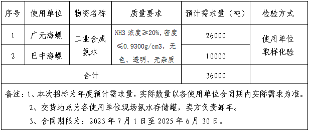 川渝區(qū)域廣元海螺、巴中海螺2023-2025年生產(chǎn)脫硝用工業(yè)合成氨水,具體信息如下表: