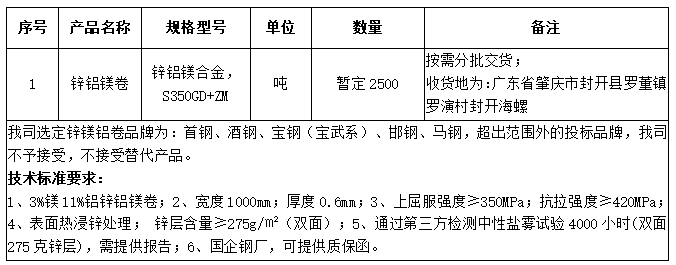 1、招標物資信息:宣城海螺建筑光伏公司2023年12月-2024年2月生產(chǎn)用鋅鎂鋁卷(根據(jù)項目結束時間)。