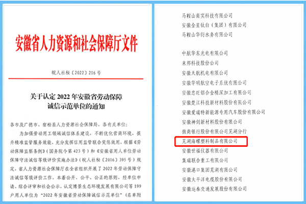 近日,安徽省人力資源和社會(huì)保障廳公布了皖人社密〔2022〕216號(hào)文《關(guān)于認(rèn)定2022年安徽省勞動(dòng)保障誠(chéng)信示范單位的通知》,蕪湖海螺塑料制品有限公司被認(rèn)定為2022年安徽省勞動(dòng)保障誠(chéng)信示范單位。