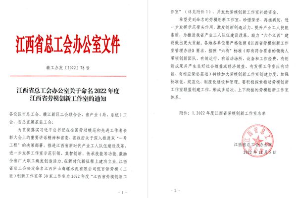 12月5日,江西省總工會下發(fā)《江西省總工會辦公室關于命名2022年度江西省勞模創(chuàng)新工作室的通知》文件,江西廬山海螺水泥有限公司倪百停勞模創(chuàng)新工作室被評為2O22年度江西省勞模創(chuàng)新工作室,并發(fā)放專項補助資金。