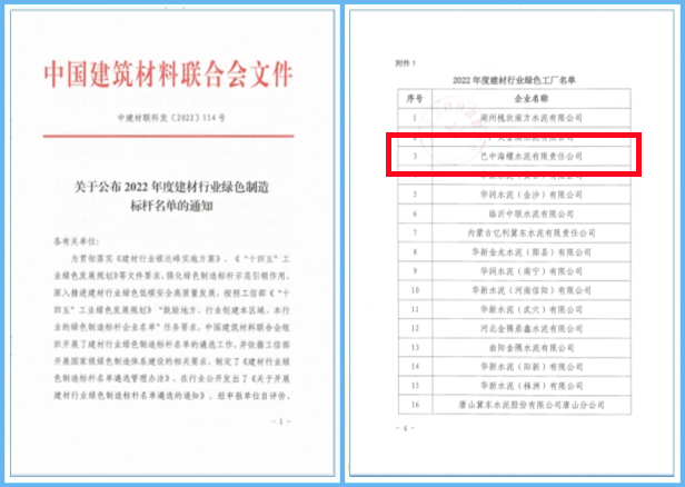 12月29日,中國(guó)建筑材料聯(lián)合會(huì)公布《2022年度建材行業(yè)綠色制造標(biāo)桿名單》,巴中海螺水泥有限責(zé)任公司喜獲2022年度建材行業(yè)綠色工廠稱(chēng)號(hào)。
