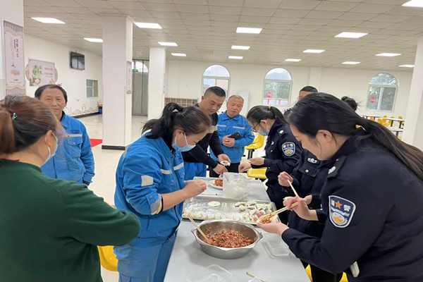 交通講座后,為營造和諧的節(jié)日警企氛圍,西周交警中隊(duì)和象山海螺員工在公司食堂開展“警民一家親歡樂迎新年”包餃子活動(dòng),喜迎春節(jié)的到來?;顒?dòng)中,大家興趣濃厚、熱情高漲、各盡所能,有的搟皮、有的和面、有的包餃子,忙得熱火朝天。在大家的共同努力下,一個(gè)個(gè)“金元寶”新鮮出爐。包餃子的同時(shí),大家一起拉家常,歡聲笑語,其樂融融的氣氛就像熱氣騰騰的餃子一樣,充分體現(xiàn)了警民魚水一家親的和諧關(guān)系。
