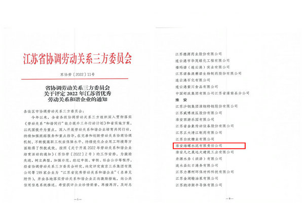 送走吉祥虎,迎來(lái)如意兔。近期,江蘇省協(xié)調(diào)勞動(dòng)關(guān)系三方委員會(huì)傳來(lái)喜訊—淮安海螺被評(píng)定為2022年江蘇省優(yōu)秀勞動(dòng)關(guān)系和諧企業(yè)。