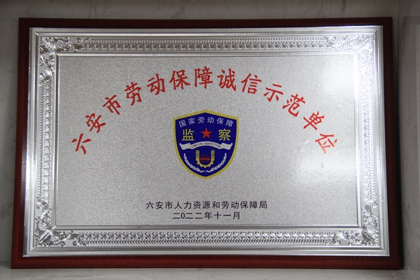 近日,在六安市勞動保障誠信示范單位授獎儀式上,六安海螺榮獲“六安市勞動保障誠信示范單位”榮譽稱號。