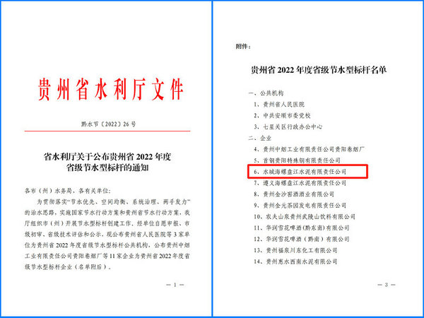 近日,貴州省水利廳下發(fā)《關(guān)于公布貴州省2022年度省級節(jié)水型標(biāo)桿的通知》,共有3家公共機(jī)構(gòu)及11家企業(yè)單位上榜,水城海螺名列其中,獲評“貴州省節(jié)水型標(biāo)桿企業(yè)”,是六盤水市唯一一個獲評節(jié)水型標(biāo)桿企業(yè)。