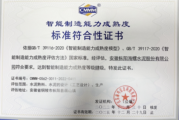 近日,樅陽海螺通過智能制造能力成熟度四級評估并獲得證書,標(biāo)志著樅陽海螺智能制造能力已經(jīng)達(dá)到行業(yè)先進(jìn)水平。