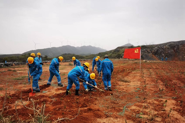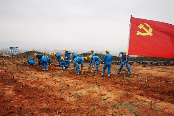 在礦山平臺植樹現(xiàn)場,支部黨員分工合作,拿起鐵鍬、鋤頭等工具,齊心協(xié)力揮鍬鏟土,大家配合默契,干勁十足,新種植的紅葉石楠幼苗迎風挺立,成了一道亮麗的風景線。本次礦山復綠計劃包含40000余棵紅葉石楠樹苗、200余棵桃樹苗、200余棵爬山虎苗和800公斤草籽,各類綠化苗木的種植將有力促進公司礦山恢復治理,進一步改善礦山面貌。