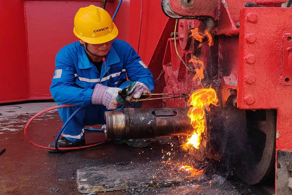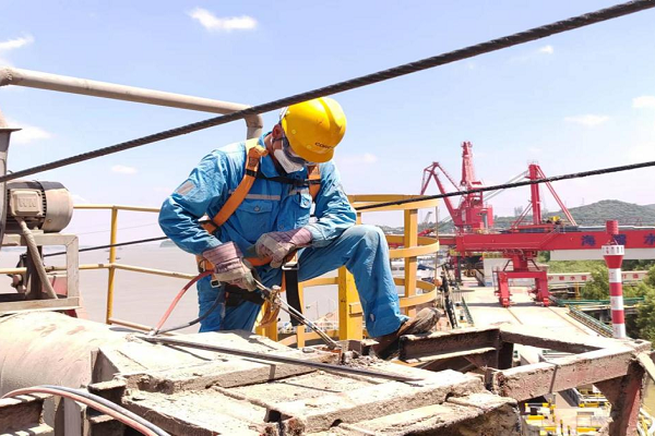 工段長操興勇為了應(yīng)對(duì)大風(fēng)、暴雨等惡劣天氣,保障裝船機(jī)能夠自動(dòng)行走控制,久經(jīng)“烤”驗(yàn)的他卻并不服“暑”,利用氧氣乙炔割刀為裝船機(jī)更換行走減速機(jī),對(duì)待檢修工作一絲不茍、嚴(yán)謹(jǐn)認(rèn)真,湛藍(lán)的工作服濕了又干,干了又濕,像釘子一樣釘在崗位上,全力保障設(shè)備正常開機(jī)。