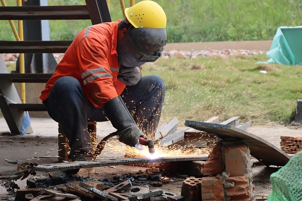 雙重“烤”驗(yàn)下,焊工成“汗”工。暑氣蒸騰,焊接、切割等工種的員工還需要戴著手套和面罩進(jìn)行作業(yè),一張張染著紅暈的面孔上已經(jīng)掛滿了汗珠。在高溫與火焰的雙重“烤”驗(yàn)下,與溫度一同飆升的是海螺人的火熱干勁。