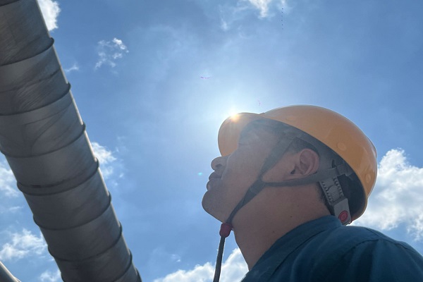 為提高收塵效果,高空作業(yè)人員張孟,不懼高溫,在做好安全保障措施后,登上1號(hào)裝船機(jī)最高處更換伸縮方管,即使頭頂烈日、汗流浹背,也抵擋不住他為完成任務(wù),力戰(zhàn)高溫的工作熱情。