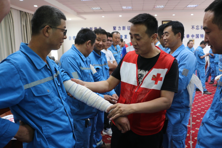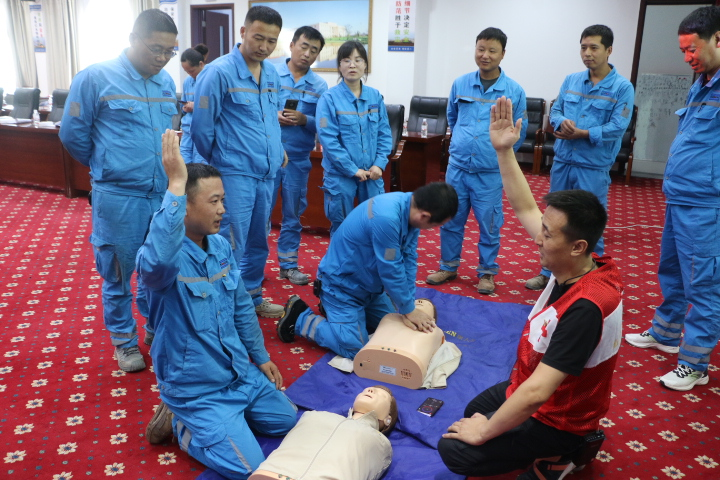 “要注意按壓部位要準(zhǔn)確,按壓力要均勻適度,注意肘關(guān)節(jié)伸直,雙肩位于雙手的正上方,手指不應(yīng)加壓于病人胸部,在按壓間隙的放松期,操作者不加任何壓力,但手掌根仍置于胸骨中下半部,不離開胸壁,以免移位……”課堂上授課老師繪聲繪色地講述,大家認(rèn)真的傾聽和記錄,生怕漏掉一個(gè)步驟。咸陽紅十字會魏巍、李建軍、黨熠三位老師通過豐富的圖片、案例以及實(shí)操演練讓在場每位員工學(xué)會了心肺復(fù)蘇、人工呼吸、創(chuàng)傷救護(hù)等應(yīng)急救護(hù)知識,讓大家體會到科學(xué)急救的重要性。
