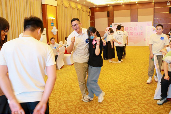 聯(lián)誼活動(dòng)在主持人的開場白中正式拉開序幕,男女嘉賓根據(jù)抽取的號(hào)碼牌進(jìn)行匹配,男女搭檔一組,共6組進(jìn)行游戲互動(dòng),男嘉賓蒙眼“戰(zhàn)斗”,女嘉賓“守護(hù)”男嘉賓,隨著歡快熱烈的互動(dòng),現(xiàn)場嘉賓的熱情被逐漸點(diǎn)燃,與會(huì)單身青年逐漸沒有了活動(dòng)開始時(shí)的幾分矜持和羞澀。