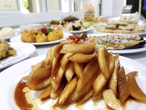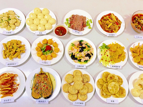 隨著一道道撲鼻的香氣,香油蘿卜、咸蛋黃茄子、油炸香蕉、土豆芝麻餅等美味菜肴呈現(xiàn)在大家面前,迎來了評委點評打分環(huán)節(jié)。