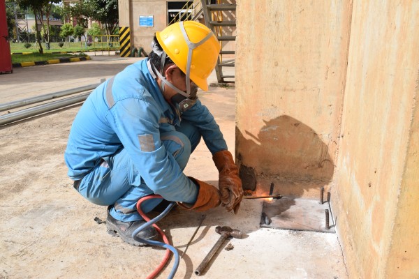 不懼熱浪“烤”驗,焊花飛舞,保山海螺的焊工們一個個全神貫注。在窯尾盤根密封更換和明管改造作業(yè)時,他們戴著手套、面罩,頂著炎熱的天氣進行焊接作業(yè),面孔掛滿汗珠,汗水浸濕衣背,映襯的是海螺人昂揚向上的火熱干勁,見證的是海螺人“團結、創(chuàng)新、敬業(yè)、奉獻”的企業(yè)文化精神。