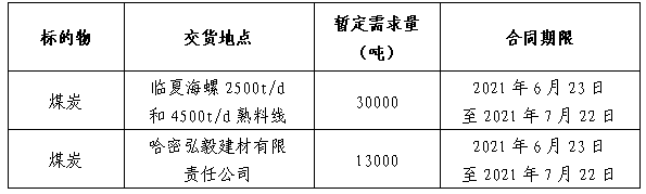 為做好臨夏海螺及哈密弘毅公司7月份煤炭采購工作,滿足生產(chǎn)需要,本著“公開、公平、公正”的原則,擬對煤炭供貨進行公開招標,現(xiàn)將招標采購信息發(fā)布如下: