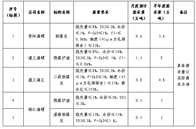 海螺水泥貴州區(qū)域擬對(duì)2021年下半年水泥生產(chǎn)用粉煤灰、燃煤爐渣進(jìn)行二次公開招標(biāo),選定中標(biāo)單位,現(xiàn)將相關(guān)招標(biāo)事宜公示如下: