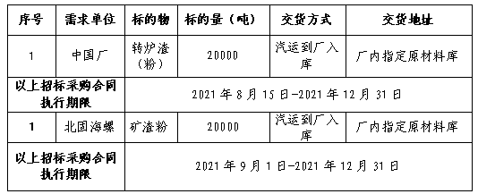 1.1中國廠、北固海螺2021年下半年轉(zhuǎn)爐渣(粉)、礦渣粉采購招標(biāo)業(yè)務(wù)招標(biāo)編號(hào):JSGY-20210704;