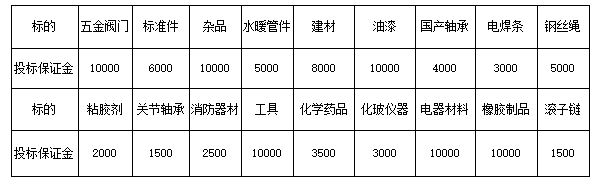 1.標(biāo)的內(nèi)容:五金閥門、電焊條、滾子鏈、橡膠制品、電器材料、化玻儀器、化學(xué)藥品、工具、消防器材、粘膠劑、油漆、鋼絲繩、國產(chǎn)軸承、關(guān)節(jié)軸承、建材、水暖管件、雜品、標(biāo)準(zhǔn)件。