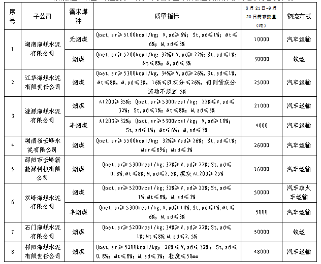 根據(jù)2021年8月21日-2021年9月20日海螺水泥湖南區(qū)域各子公司煤炭需求,現(xiàn)擬對煤炭進行公開招標,選定中標人,為體現(xiàn)公平、公正、公開的原則,拓寬采購渠道,現(xiàn)將招標相關事宜公告如下: