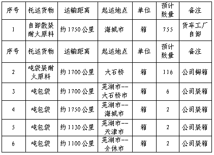 1.2起止地點(diǎn):原料裝運(yùn)起點(diǎn)為遼寧省海城市/大石橋市供貨單位指定裝貨倉(cāng)庫(kù)—終點(diǎn)安徽海螺暹羅耐火材料公司倉(cāng)庫(kù);噸袋裝運(yùn)為海螺耐火材料公司倉(cāng)庫(kù)至大石橋市、海城市、天津市、介休市。