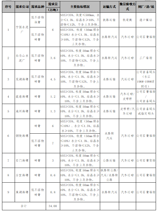 根據(jù)海螺水泥各公司生產(chǎn)經(jīng)營計(jì)劃,安徽銅陵海螺水泥有限公司聯(lián)合華東地區(qū)部分公司對(duì)天然石膏進(jìn)行聯(lián)合招標(biāo),為進(jìn)一步體現(xiàn)公平、公正、公開的原則,拓寬采購渠道,提高采購質(zhì)量,現(xiàn)將招標(biāo)采購信息發(fā)布如下: