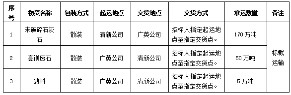 根據(jù)生產(chǎn)用料需要,廣東清新水泥有限公司及廣東清遠廣英水泥有限公司擬對兩公司間石灰石、石粉、熟料等原材料運輸業(yè)務面向社會公開招標,本著“公開、公平、公正”的競爭原則,選擇具備經(jīng)營能力較好、運輸資質(zhì)合格、保供和服務能力強的運輸保供單位,歡迎具備條件的運輸單位參加,現(xiàn)將有關事項公示如下: