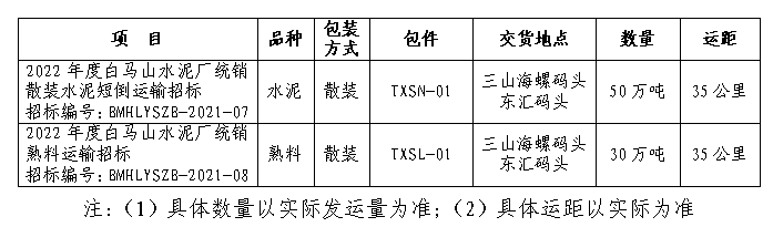 依據(jù)2022年白馬山水泥廠年度產(chǎn)銷計劃,對散裝水泥、熟料通過汽車短倒至碼頭裝船開展運輸招標。