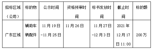 廣東區(qū)域擬對2022年度輔助車輛配件項目進行公開招標,為進一步體現(xiàn)公平、公正、公開的原則,拓寬采購渠道,提高招標質(zhì)量,現(xiàn)將相關(guān)事宜公告如下: