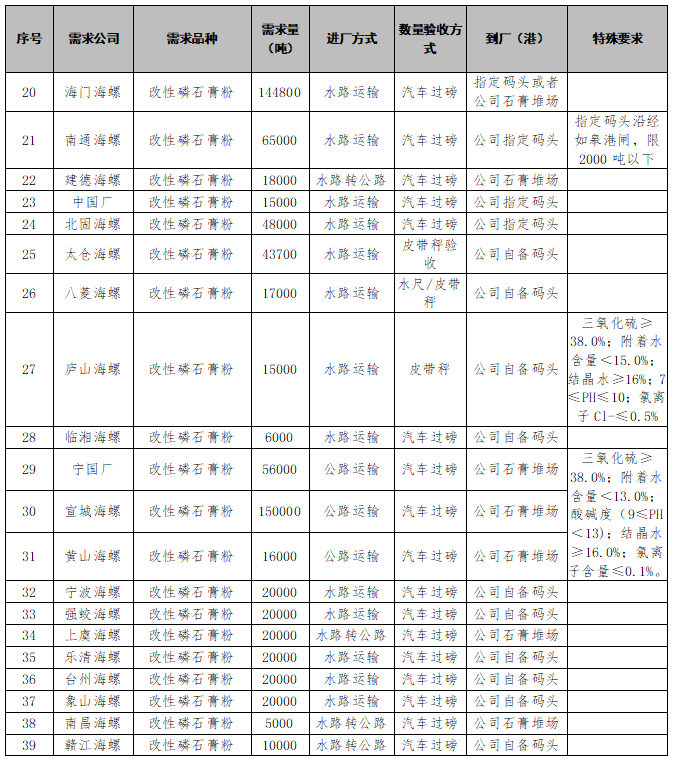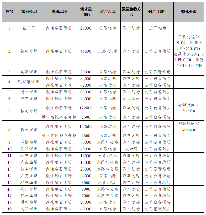 根據(jù)海螺水泥各公司生產(chǎn)經(jīng)營(yíng)計(jì)劃,安徽銅陵海螺水泥有限公司聯(lián)合華東及中部地區(qū)部分公司對(duì)磷石膏進(jìn)行聯(lián)合招標(biāo),為進(jìn)一步體現(xiàn)公平、公正、公開的原則,拓寬采購(gòu)渠道,提高采購(gòu)質(zhì)量,現(xiàn)將招標(biāo)采購(gòu)信息發(fā)布如下: