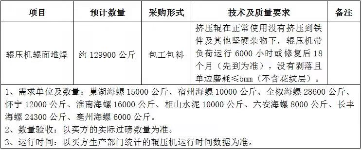 根據(jù)生產(chǎn)經(jīng)營需求,本著“公開、公平、公正、誠實信用和競爭、擇優(yōu)”原則,海螺水泥皖北區(qū)域下屬宿州海螺、全椒海螺、巢湖海螺、懷寧海螺、淮北相山、淮南海螺、六安海螺、長豐海螺、亳州海螺等九家公司擬聯(lián)合開展2021年皖北區(qū)域輥壓機輥面堆焊包工包料業(yè)務公開招標,歡迎具備條件的單位參加,現(xiàn)將招標相關事項公示如下: