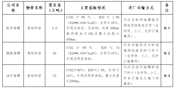 根據(jù)池州、銅陵和樅陽海螺公司實(shí)際生產(chǎn)需求,本著“公開、公平、公正”的原則,擬對(duì)直供高硅砂巖進(jìn)行公開招標(biāo),歡迎具備條件的單位參加,現(xiàn)將招標(biāo)相關(guān)事宜公告如下:
