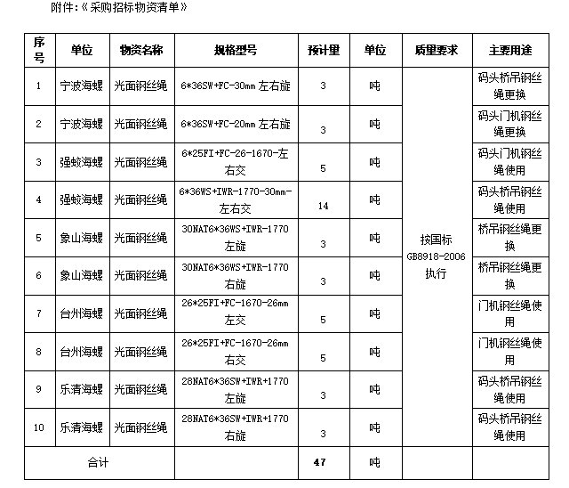 2022年度浙江區(qū)域五家子公司(寧波海螺、象山海螺、強(qiáng)蛟海螺、臺(tái)州海螺、樂(lè)清海螺)因生產(chǎn)維修需要,需對(duì)碼頭門機(jī)及日常生產(chǎn)所用鋼絲繩進(jìn)行招標(biāo)。為進(jìn)一步體現(xiàn)公平、公正、公開的原則,拓寬采購(gòu)渠道,提高采購(gòu)質(zhì)量,現(xiàn)將相關(guān)事宜公告如下: