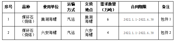 巢湖海螺水泥有限責任公司、六安海螺水泥有限責任公司擬對2022年上半年煤矸石(燒結)采購進行公開招標,選定中標人?,F(xiàn)將相關事宜公告如下:
