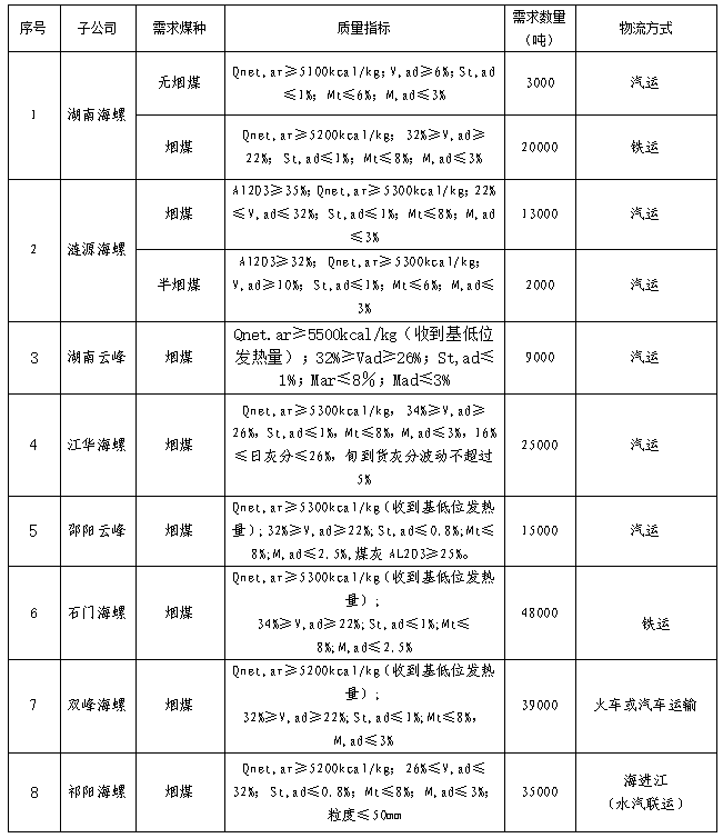 根據(jù)2021年12月21日-2022年1月20日海螺水泥湖南區(qū)域各子公司煤炭需求,現(xiàn)擬對(duì)煤炭進(jìn)行公開招標(biāo),選定中標(biāo)人,為體現(xiàn)公平、公正、公開的原則,拓寬采購(gòu)渠道,現(xiàn)將招標(biāo)相關(guān)事宜公告如下: