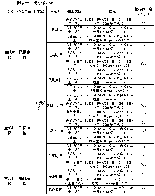 投標(biāo)申請(qǐng)人需承擔(dān)與遞交投標(biāo)文件有關(guān)的費(fèi)用,投標(biāo)申請(qǐng)人在領(lǐng)取標(biāo)書(shū)前,應(yīng)以投標(biāo)公司名義和銀行轉(zhuǎn)賬方式交納貳佰元標(biāo)書(shū)費(fèi),投標(biāo)人應(yīng)在投遞標(biāo)書(shū)之前以投標(biāo)公司名義和銀行轉(zhuǎn)賬方式繳納投標(biāo)保證金(具體費(fèi)用如表中所示),待招標(biāo)結(jié)束后,未中標(biāo)單位交納的投標(biāo)保證金待開(kāi)標(biāo)后由鳳凰建材公司在10個(gè)工作日內(nèi)無(wú)息退還投標(biāo)人,中標(biāo)人的投標(biāo)保證金自動(dòng)轉(zhuǎn)為合同履約保證金,不足部分中標(biāo)人在合同簽訂前以電匯方式(不接受個(gè)人轉(zhuǎn)賬)補(bǔ)齊,合同履約保證金在年度合同履行完畢后30日內(nèi)無(wú)息退還。招標(biāo)人不收取任何現(xiàn)金,不接受以個(gè)人賬戶轉(zhuǎn)賬。