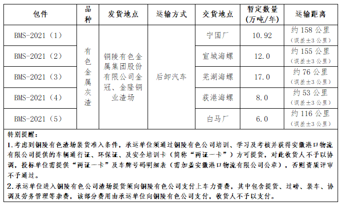 4.2 本次招標活動要求投標單位具有運輸保供經(jīng)驗(要求提供相關(guān)證明)和強大的保供能力(在遵守2011年7月1日、2011年8月1日和2014年6月1日及2016年9月21日頒布的《公路安全保護條例》、《公路超限檢測站管理辦法》及《安徽省治理貨物運輸車輛超限超載條例、《超限運輸車輛行駛公路管理規(guī)定》等法律、法規(guī)的前提下,24小時有色金屬灰渣運輸能力須達到2000噸,招標人根據(jù)國家核載車型載重噸位標準審查投標人承運車數(shù)是否能夠滿足運力要求,必須具有足夠的運輸車輛合法運載,且承運車輛必須為后卸式,滿足招標單位24小時運輸要求,不能影響招標單位正常的生產(chǎn)經(jīng)營活動。
