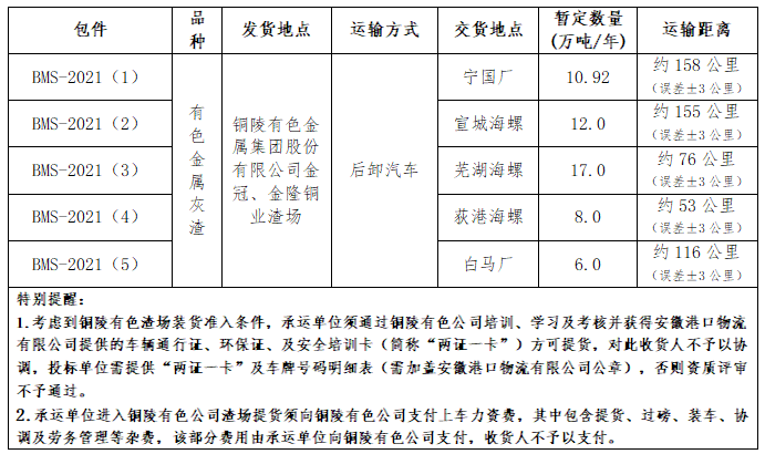 銅陵有色金屬集團(tuán)股份有限公司(簡(jiǎn)稱“銅陵有色公司”)金冠、金隆銅業(yè)渣場(chǎng)至寧國(guó)廠、宣城海螺、蕪湖海螺、荻港海螺及白馬廠有色金屬灰渣運(yùn)輸項(xiàng)目,年運(yùn)量共計(jì)約53.92萬(wàn)噸。