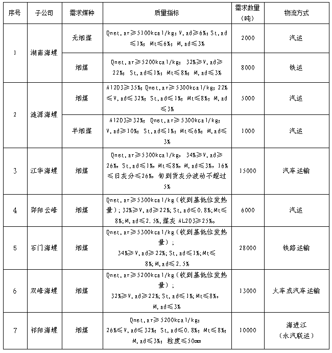 根據(jù)2022年1月21日-2022年2月20日海螺水泥湖南區(qū)域各子公司煤炭需求,現(xiàn)擬對(duì)煤炭進(jìn)行公開招標(biāo),選定中標(biāo)人,為體現(xiàn)公平、公正、公開的原則,拓寬采購(gòu)渠道,現(xiàn)將招標(biāo)相關(guān)事宜公告如下: