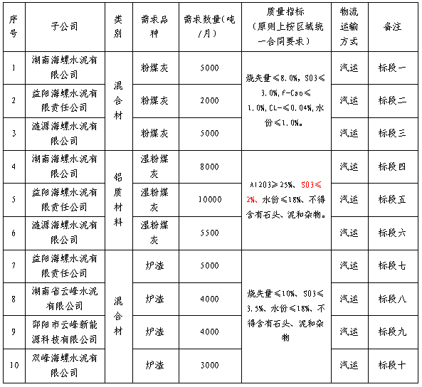 根據湖南、漣源、雙峰、益陽海螺、湖南云峰和邵陽云峰六家公司2022年3月1日至2022年8月31日電廠廢渣(含粉煤灰、濕粉煤灰、爐渣等)的需求,現(xiàn)擬對電廠廢渣進行招標,選定中標人,為體現(xiàn)公平、公正、公開的原則,拓寬采購渠道,現(xiàn)通過海螺物資陽光采購平臺(登陸網址:ygcg.conch.cn)進行公開招標,招標相關事宜公告如下: