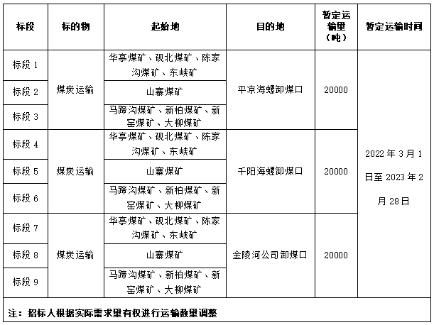 現(xiàn)對平涼海螺、千陽海螺和金陵河公司2022年華亭煤炭運輸組織公開招標,為進一步體現(xiàn)公平、公正、公開透明的原則,現(xiàn)將招標信息發(fā)布如下:
