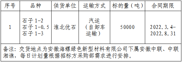 為做好2022年3-8月份淮北優(yōu)石新型環(huán)保建材有限責任公司(以下簡稱:淮北優(yōu)石)至安徽中聯(lián)、中聯(lián)湘譙骨料運輸招標工作,由安徽海螺綠色新材料有限公司采購部牽頭,對上述線路骨料運輸進行公開招標,特將本次招投標的有關事宜公告如下: