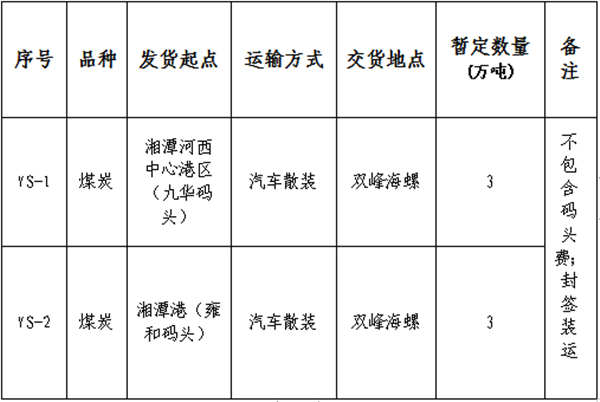 1、招標(biāo)內(nèi)容:湘潭河西中心港區(qū)(九華碼頭)、湘潭港(雍和碼頭)至雙峰海螺的煤炭中轉(zhuǎn)運(yùn)輸。
