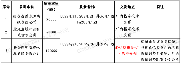 根據(jù)招標(biāo)計劃安排由陽春海螺牽頭開展扶綏海螺、北流海螺和陽春海螺三公司2022-2023年度云浮硅質(zhì)渣(硫鐵礦渣)聯(lián)合招標(biāo)采購工作,為進一步體現(xiàn)公平、公正、公開的原則,現(xiàn)將招標(biāo)采購信息發(fā)布如下: