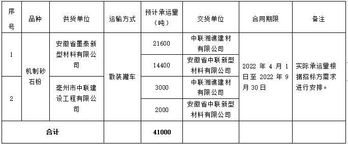 為做好2022年4-9月份安徽墨泰和亳州中聯(lián)機(jī)制砂石粉至安徽中聯(lián)、中聯(lián)湘譙短倒運(yùn)輸招標(biāo)工作,由安徽海螺綠色新材料有限公司采購(gòu)部牽頭,對(duì)上述線(xiàn)路運(yùn)輸進(jìn)行公開(kāi)招標(biāo),特將本次招投標(biāo)的有關(guān)事宜公告如下: